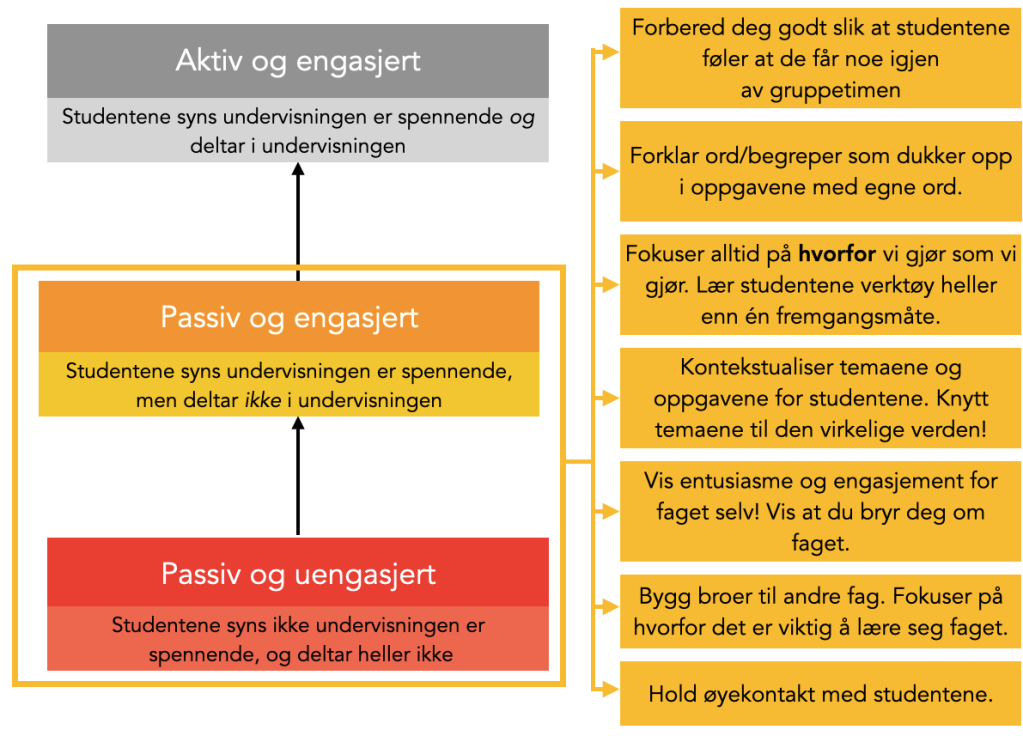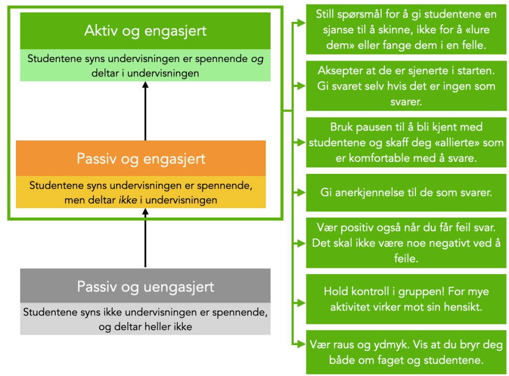 En god start kan være å først komme oss opp til en situasjon med passive og engasjerte studenter. Her er noen konkrete tips: