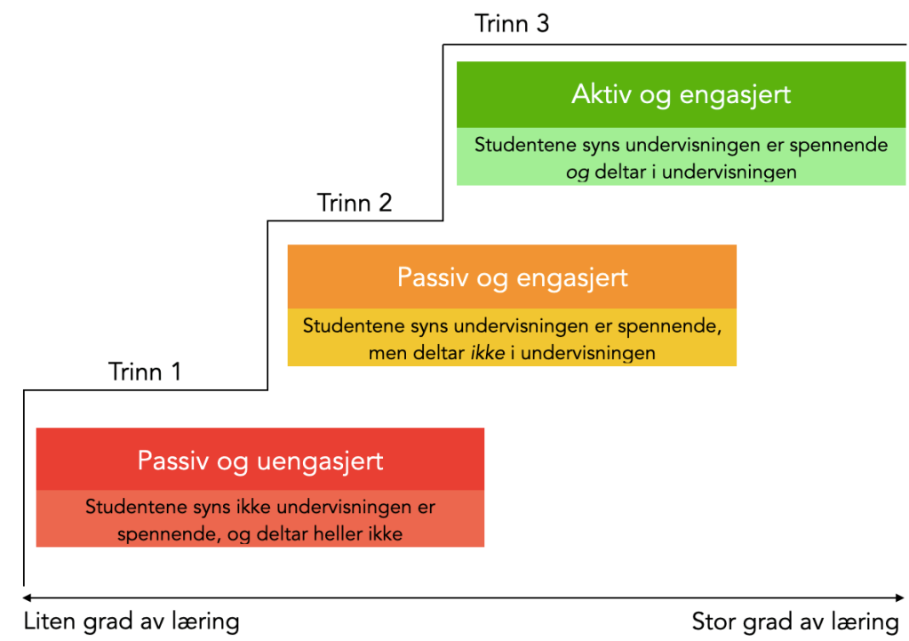 De tre situasjonene beskrevet i figuren kan anses som trappetrinn. Hvis man har som utgangspunkt passive og uengasjerte studenter, så må man gjerne først gjennom det andre trinnet «passiv og engasjert» før man når helt opp til det øverste trinnet «aktiv og engasjert». Det hjelper tross alt ikke å forsøke å stille spørsmål til studenter som ikke henger med eller ikke bryr seg.