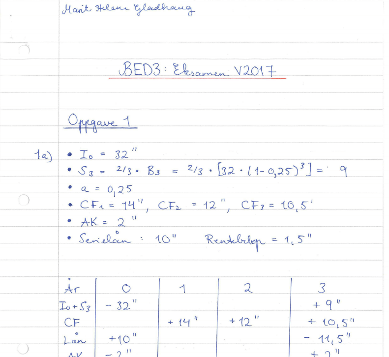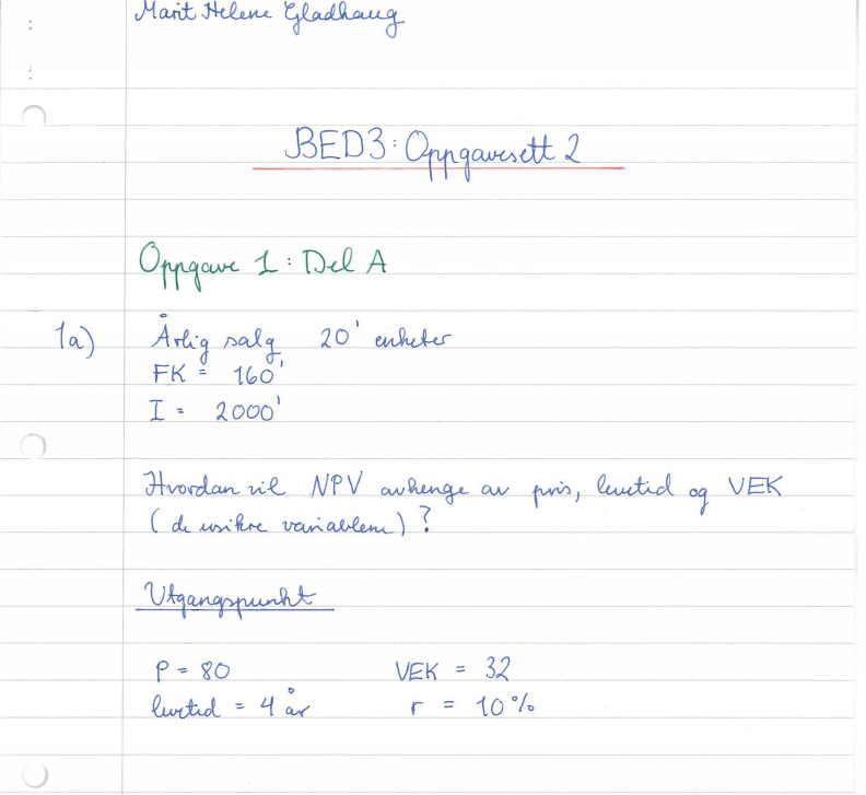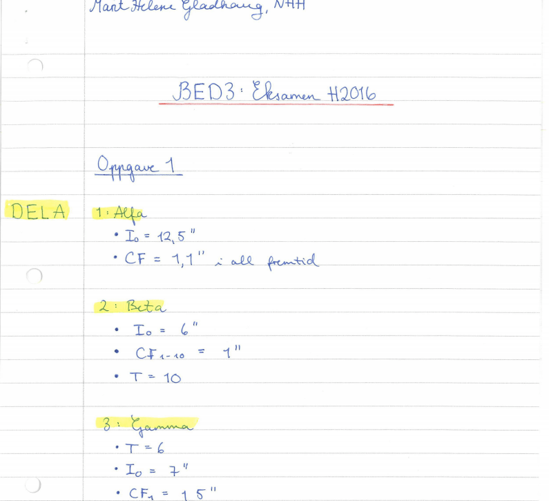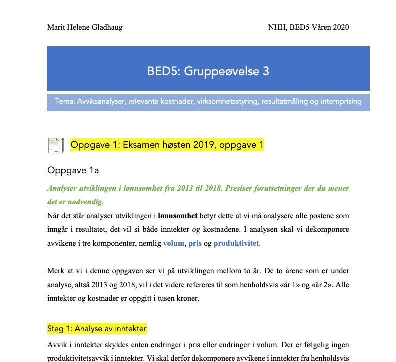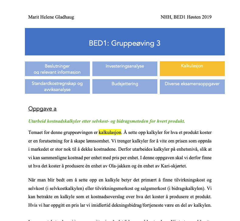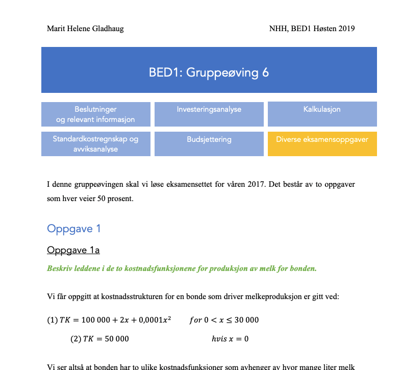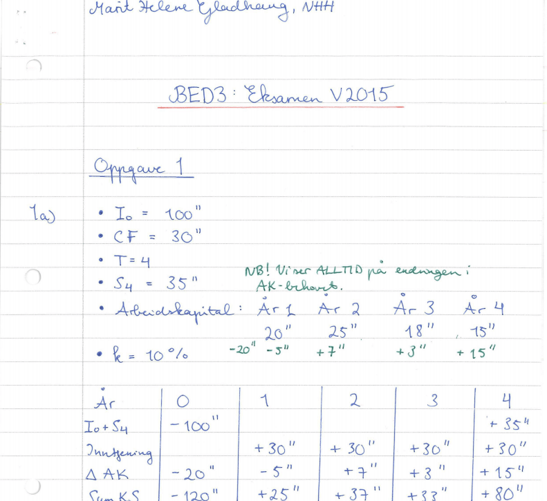 Bedriftsøkonomi BED1 – Grunnleggende bedriftsøkonomi Løsningsforslag til gruppeøving 1LAST NED Løsningsforslag til gruppeøving 2Last ned Løsningsforslag til gruppeøving 3LAST NED Løsningsforslag til gruppeøving 4LAST NED Løsningsforslag til gruppeøving 5LAST NED Løsningsforslag til gruppeøving 6LAST NED BED2 – Finansregnskap Gruppesamling 1 LAST NED Gruppesamling 2 LAST NED Gruppesamling 3 LAST NED Gruppesamling 4 LAST NED Gruppesamling 5 LAST NED Eksamensoppgaver 2013-2016LAST NED Løsningsforslag til eksamen våren 2013LAST NED Løsningsforslag til eksamen våren 2014LAST NED Løsningsforslag til eksamen høsten 2014LAST NED Løsningsforslag til eksamen våren 2015LAST NED Løsningsforslag til eksamen høsten 2015LAST NED Løsningsforslag til eksamen våren 2016LAST NED Forelesningsnotater LAST NED NotaterLAST NED BED3 – Investering og finans Løsningsforslag til oppgavesett 1 (digitalt) LAST NED Løsningsforslag til oppgavesett 1 (håndskrevet)LAST NED Løsningsforslag til oppgavesett 2LAST NED Løsningsforslag til oppgavesett 3LAST NED Løsningsforslag til oppgavesett 4LAST NED Løsningsforslag til oppgavesett 5LAST NED Viktige momenter fra oppgavesettene LAST NED Eksamensoppgaver 2015-2017LAST NED Løsningsforslag til eksamen våren 2015LAST NED Løsningsforslag til eksamen høsten 2015LAST NED Løsningsforslag til eksamen våren 2016LAST NED Løsningsforslag til eksamen høsten 2016LAST NED Løsningsforslag til eksamen våren 2017LAST NED Løsningsforslag til eksamen høsten 2017LAST NED Viktige momenter fra eksamenssettene LAST NED Formelark med kommentarerLAST NED Oversikt over pensumLAST NED Nyttige linker: Forklaring til oppgave 1c, oppgavesett 5 i BED3 Hvordan løse ligninger ved hjelp av Solver på kalkulator BED4 – Bedriftsøkonomiske beslutninger Sammendrag LAST NED BED5 – Økonomisystemer og økonomistyring Løsningsforslag til gruppeøvelse 1 LAST NED Løsningsforslag til gruppeøvelse 2 LAST NED Løsningsforslag til gruppeøvelse 3 LAST NED Løsningsforslag til innlevering 1 LAST NED Løsningsforslag til innlevering 3 LAST NED Guide og formler til avviksanalyse LAST NED Viktige momenter LAST NED