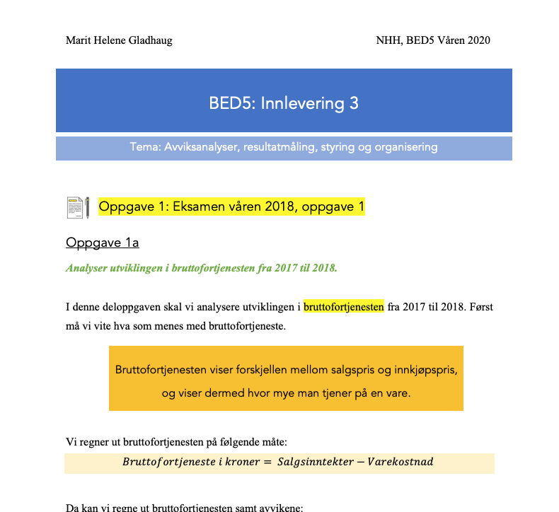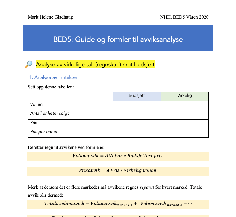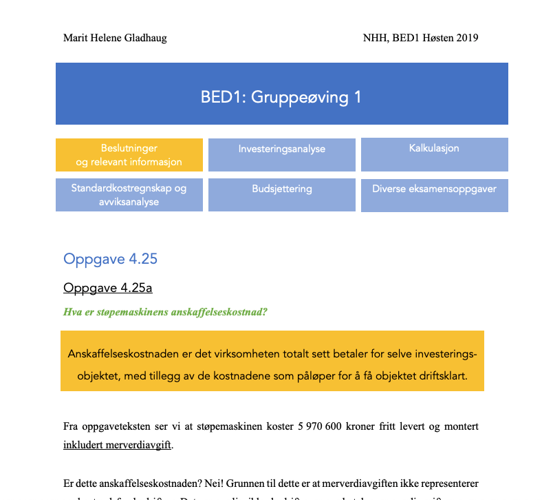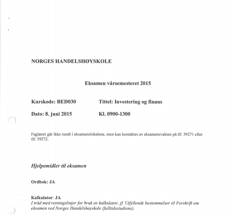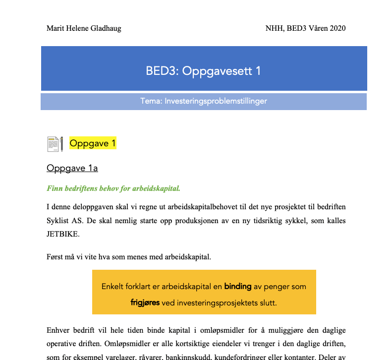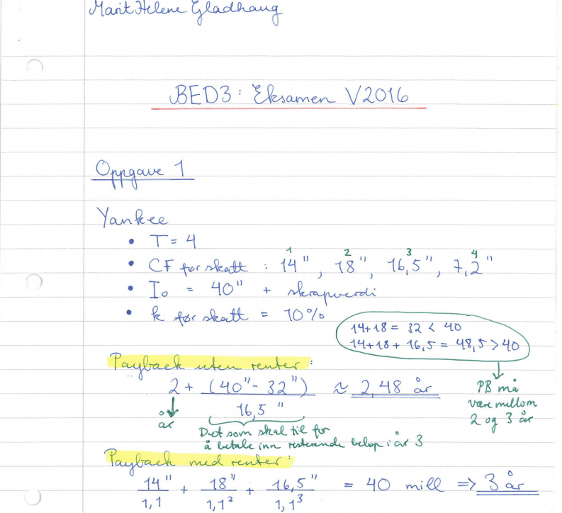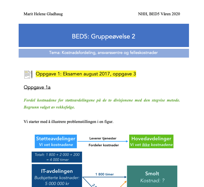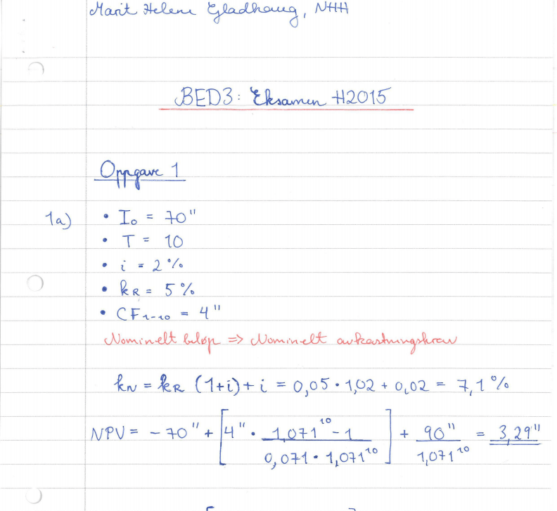 Bedriftsøkonomi BED1 – Grunnleggende bedriftsøkonomi Løsningsforslag til gruppeøving 1LAST NED Løsningsforslag til gruppeøving 2Last ned Løsningsforslag til gruppeøving 3LAST NED Løsningsforslag til gruppeøving 4LAST NED Løsningsforslag til gruppeøving 5LAST NED Løsningsforslag til gruppeøving 6LAST NED BED2 – Finansregnskap Gruppesamling 1 LAST NED Gruppesamling 2 LAST NED Gruppesamling 3 LAST NED Gruppesamling 4 LAST NED Gruppesamling 5 LAST NED Eksamensoppgaver 2013-2016LAST NED Løsningsforslag til eksamen våren 2013LAST NED Løsningsforslag til eksamen våren 2014LAST NED Løsningsforslag til eksamen høsten 2014LAST NED Løsningsforslag til eksamen våren 2015LAST NED Løsningsforslag til eksamen høsten 2015LAST NED Løsningsforslag til eksamen våren 2016LAST NED Forelesningsnotater LAST NED NotaterLAST NED BED3 – Investering og finans Løsningsforslag til oppgavesett 1 (digitalt) LAST NED Løsningsforslag til oppgavesett 1 (håndskrevet)LAST NED Løsningsforslag til oppgavesett 2LAST NED Løsningsforslag til oppgavesett 3LAST NED Løsningsforslag til oppgavesett 4LAST NED Løsningsforslag til oppgavesett 5LAST NED Viktige momenter fra oppgavesettene LAST NED Eksamensoppgaver 2015-2017LAST NED Løsningsforslag til eksamen våren 2015LAST NED Løsningsforslag til eksamen høsten 2015LAST NED Løsningsforslag til eksamen våren 2016LAST NED Løsningsforslag til eksamen høsten 2016LAST NED Løsningsforslag til eksamen våren 2017LAST NED Løsningsforslag til eksamen høsten 2017LAST NED Viktige momenter fra eksamenssettene LAST NED Formelark med kommentarerLAST NED Oversikt over pensumLAST NED Nyttige linker: Forklaring til oppgave 1c, oppgavesett 5 i BED3 Hvordan løse ligninger ved hjelp av Solver på kalkulator BED4 – Bedriftsøkonomiske beslutninger Sammendrag LAST NED BED5 – Økonomisystemer og økonomistyring Løsningsforslag til gruppeøvelse 1 LAST NED Løsningsforslag til gruppeøvelse 2 LAST NED Løsningsforslag til gruppeøvelse 3 LAST NED Løsningsforslag til innlevering 1 LAST NED Løsningsforslag til innlevering 3 LAST NED Guide og formler til avviksanalyse LAST NED Viktige momenter LAST NED
