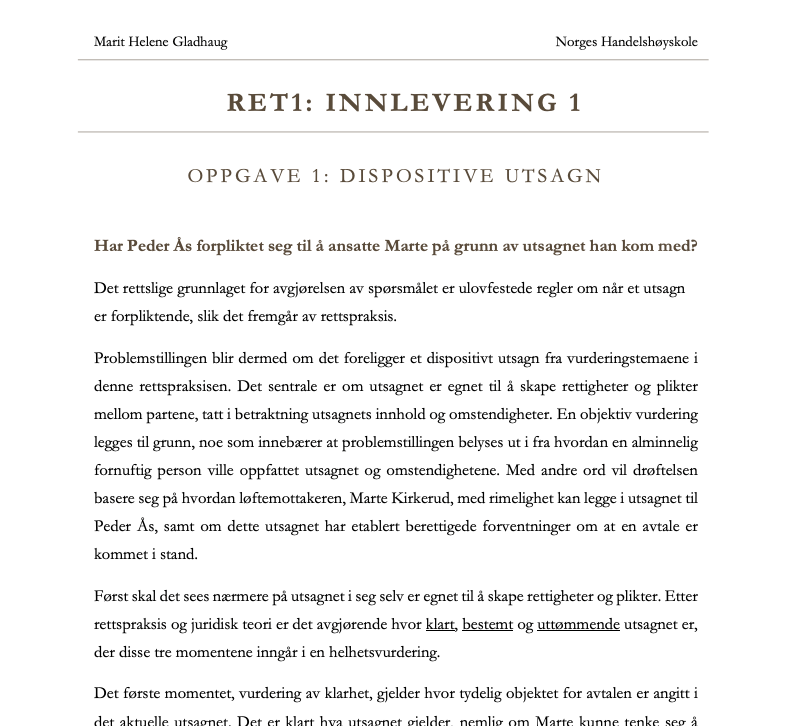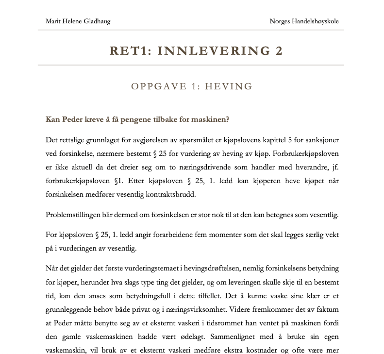 Rettslære RET1 – Rettslære for økonomer Innlevering 1: Dispositive utsagn og ugyldighet LAST NED Innlevering 2: Heving og erstatning ved forsinkelse LAST NED